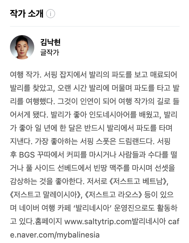 여행작가 김낙현입니다. 2016년부터 솔티트립(SALTYTRIP)이라는 사이트를 운영 중 입니다. 파도를 찾아 다니기도 하고 파도가 없는 곳에서는 태양을 따라 다니기도 합니다. 그래서 언제나 솔티합니다. 물론 바닷가의 솔티함을 쫓아갈만한 것이 없다고 생각하지만 열심히 흘린 땀으로 인한 솔티함도 나쁘지는 않다는 걸 알게되었습니다. 행여나 여행을 통해 짭짭한 솔티함을 느껴보고 싶다면, 저와 함께 솔티트립을 떠나보는 건 어떨까요? 책에서는 이야기하지 못했던 솔티트리퍼의 짠내나는 여행 이야기를 해보려합니다. <Just Go 저스트고 시리즈> 베트남, 라오스, 말레이시아 편을 비롯해 <팔로우 시리즈> 싱가포르, 발리 편도 출간하였습니다.