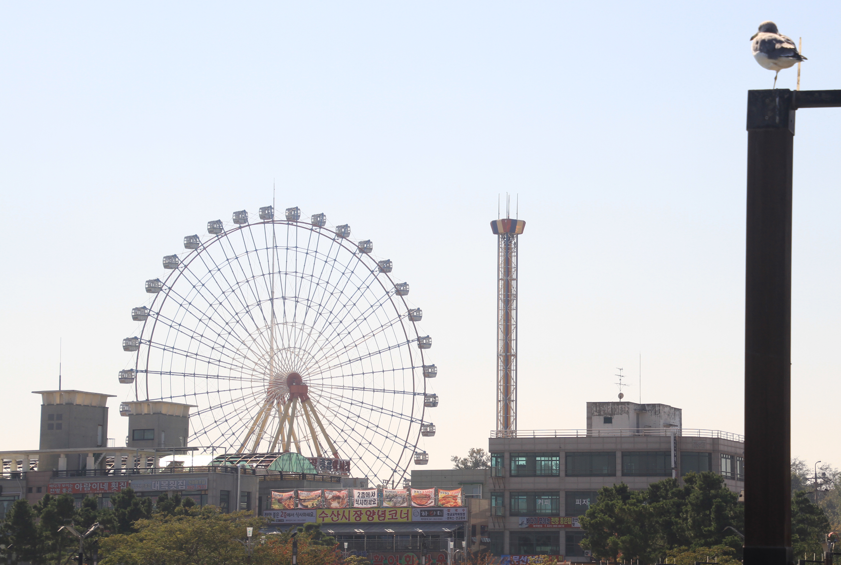 당진 여행의 마지막 코스는 삽교천이다. 숙소에서 차로 약 10분 남짓, 오전 시간이라 그런지 한적한 분위기다. 여행 중 단풍구경을 하고 싶었는데 따뜻한 날씨때문인지 단풍은 아쉽게도 볼 수가 없었다. 대신 노랗게 익은 벼들을 보며 가을을 만끽할 수 있었던 시간이었다. 시원한 바닷바람이 느껴지는 삽교천 바다공원에 도착, 데크 길을 따라 걷기 시작했다. 해양테마과학관을 비롯해 삽교천 놀이동산의 대관람차, 호텔, 식당가들이 보인다. 휴식을 취하는 바다갈매기와 주변 풍경을 카메라에 담았다.