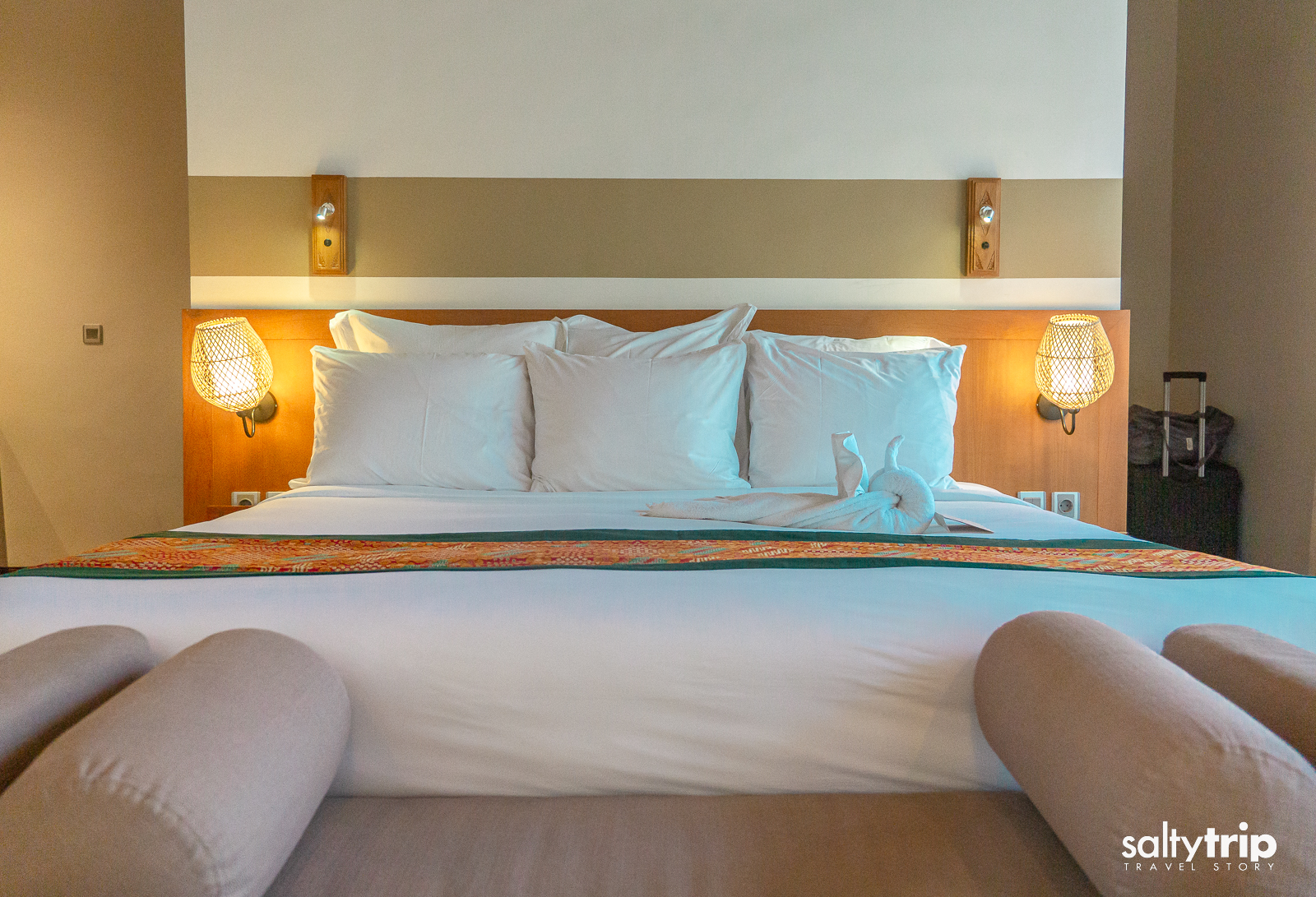 킹 사이즈 침대 옆으로는 작은 사이드 조명이 있고 침대 앞쪽으로는 데이 소파가 마련되어 있다. 침구 상태는 괜찮은 편이고 필로우는 2가지 타입으로 총 6개가 제공된다. 침대 헤드 뒤편으로 옷장과 수납 공간, 욕실이 숨겨져 있는 구조의 빌라다. 다분히 연식이 느껴지는 빌라.