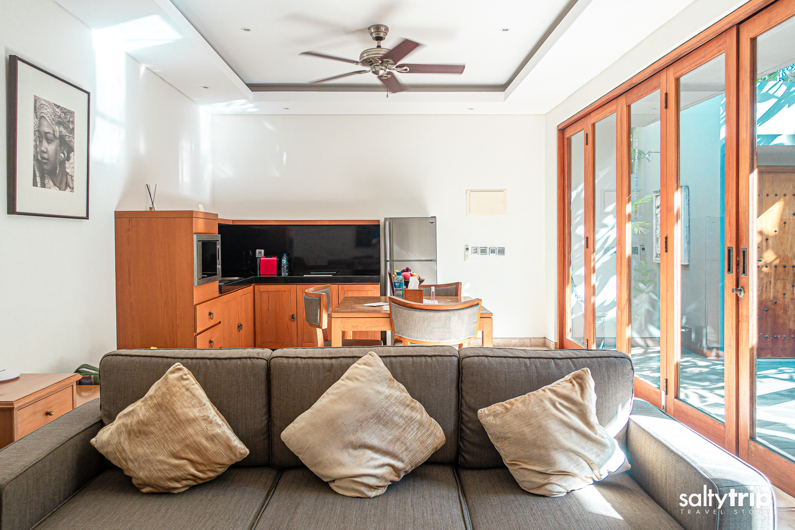 엔터테인먼트 공간이자 식사를 할 수 있는 거실에는 소파와 42인치 TV, DVD 플레이어, 에어컨과 실링 팬이 설치되어 있고 다이닝을 위한 식탁과 의자, 간단한 조리를 할 수 있는 인덕션과 냉장고, 전자렌지, 네스프레소 커피 머신 등이 마련되어 있다. 무료 미니바가 체크인 시 제공되지만 기대할 수준은 아니다. 소프트드링크 몇 개 정도.