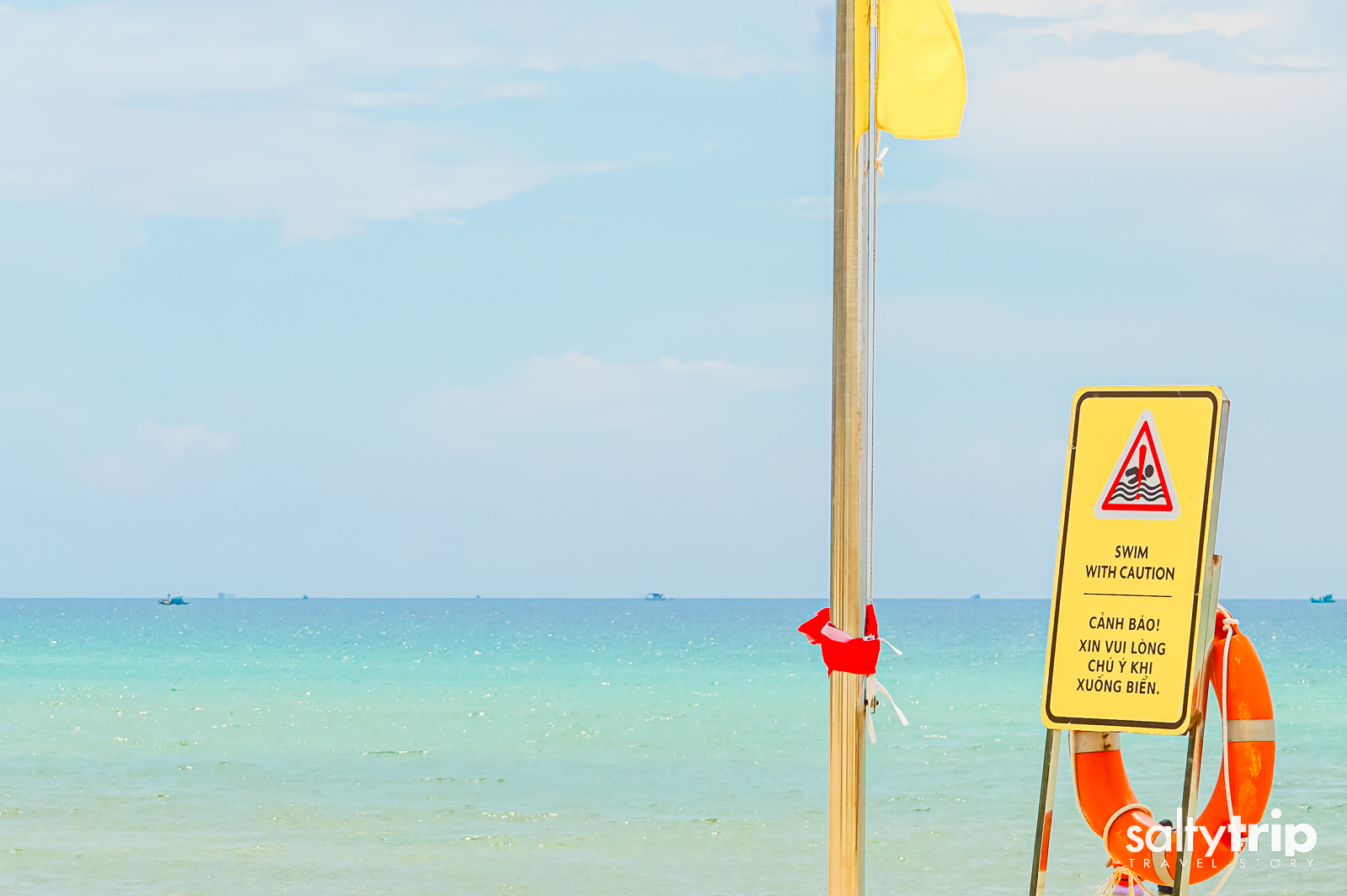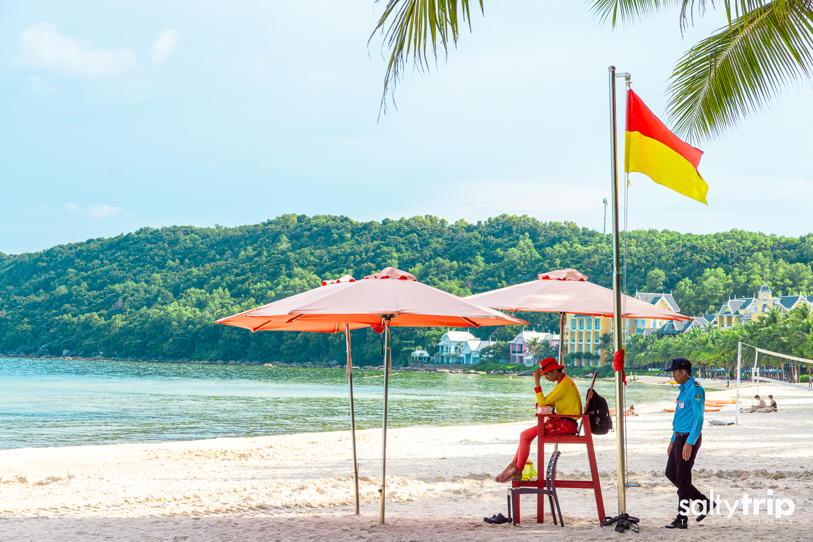 노란색 깃발이 꽂혔다. 바닷속으로 들어가도 된다는 의미다. 매일매일 날씨에 따라 깃발 색이 달라지지만, 보통은 노란색이다. 리조트 앞 해변은 다른 용어로 프라이빗 해변은 다른 해변과는 달리 관리가 잘 되어 있다. 리조트가 관리하는 해변의 장점은 언제든 시원한 에어컨이 틀어진 방으로 돌아갈 수 있다는 것. 리조트는 수영장을 이용하는 사람들과 바다 쪽 해변을 즐기는 사람으로 나뉜다. 푸꾸옥은 수심이 완만하고 경사가 급하지 않아 비교적 안전하게 물놀이를 즐길 수 있는 바다다.